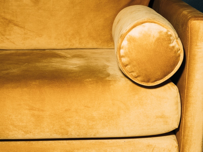 Decoración de salón con sofá mostaza